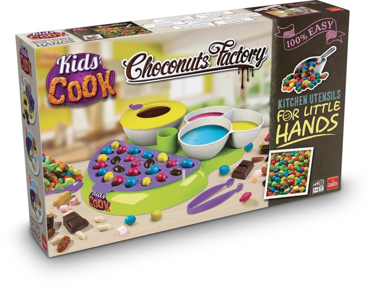Maak je eigen Choconoten met de Kid's Cook machine! Echt te eten! Speelgoedomschrijving Met de Kid's Cook Choconut Factory kan iedereen in een paar stappen z'n eigen chocolade nootjes maken! Neem eerst 24 pindas en 60g chocoola (die jij lekker vindt) en vul het gaatje met de paarse dop in de kom met warm water. Stop nu de chocola in de kom en wacht tot het mooi gesmolten is; gebruik de lepel voor het roeren. Dip de nootjes in de choolade en leg ze in de bijbehorende mallen. Als je alles gevuld hebt mogen ze 20 minuten in de koelkast liggen. In de tussentijd neem je wat eiwit en 100g suiker en roer je dit tot een mooi glazuur. Verdeel dit in 3 porties. Voeg aan het glazuur jouw kleuren toe en meng ze goed. Haal daarna de noten weer uit de koelkast. Dip de noten nu een voor een in het gekleurde glazuur en leg ze terug in de mallen. Nu mogen ze 90 minuten in de koelkast. Daarna is het smullen geblazen! Meer Kid's Cook Goliath heeft nog meer van Kid's Cook, zoals de Jelly Fruit & Beart