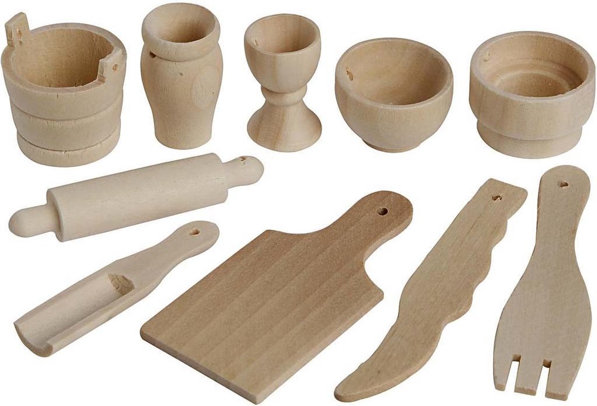Mini keukengerei van hout, ideaal als decoratie.Mini houten keuken benodigdheden - ideaal voor decoratie.