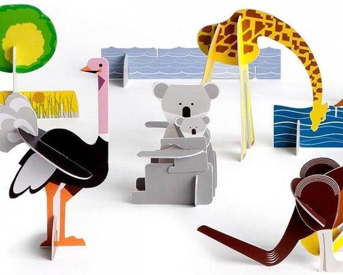 Dit Totem Book is letterlijk een boek vol dieren Druk de kartonnen stukken uit en maak alle dieren en sfeer omgevingen.\\nZie het plaatje van elk dier tot leven komen door de vleugel, staart of de poten in het model te plaatsen. \\nHet grappige stokstaartje, de vos, de slag, de kangoeroe, de walvis, de koala.... en dan zitten er nog meer verrassingen in.\\n Je kunt er mee spelen, maar ook neerzetten als prachtige decoraties.\\n Dit totem book bestaat uit 10 dieren en 10 decors en bevat in totaal 98 stukjes