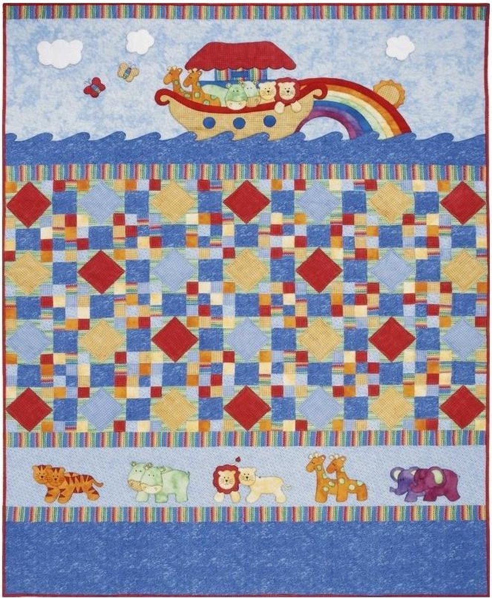 Merk: Kids Quilts. Artikel: Quiltpatroon. Onderwerp: Two by Two. Twee bij Twee. Ark van Noach. Ontwerpsters: Christine en Rachel Sharp. Dit quiltpatroon is voor het maken een prachtige quilt. Het bevat onderwerpen die met de Ark van Noach met daarin twee aan twee gerangschikte diersoorten te maken hebben. Te zien zijn onder andere olifanten, leeuwen en giraffes. In het midden is een blokpatroon aanwezig en onderaan staan ook dieren afgebeeld. Dit is een mooie quilt om bijvoorbeeld als deken voor een eenpersoonsbed te gebruiken. Er is een Engelstalige beschrijving bijgevoegd. De afmetingen van de totale quilt bedragen 152 x 200 cm. Wat is quilten? Een quilt is een doorgestikte “deken”. Deze wordt gemaakt van drie lagen textiel die op elkaar genaaid worden door middel van de quilt techniek. De zogenaamde top (de bovenste laag) kan een hele lap stof zijn. In het Engels de whole cloth of patchwork. Het woord quilt is afgeleid van het Latijnse culcita dat gevulde zak betekent. Via de