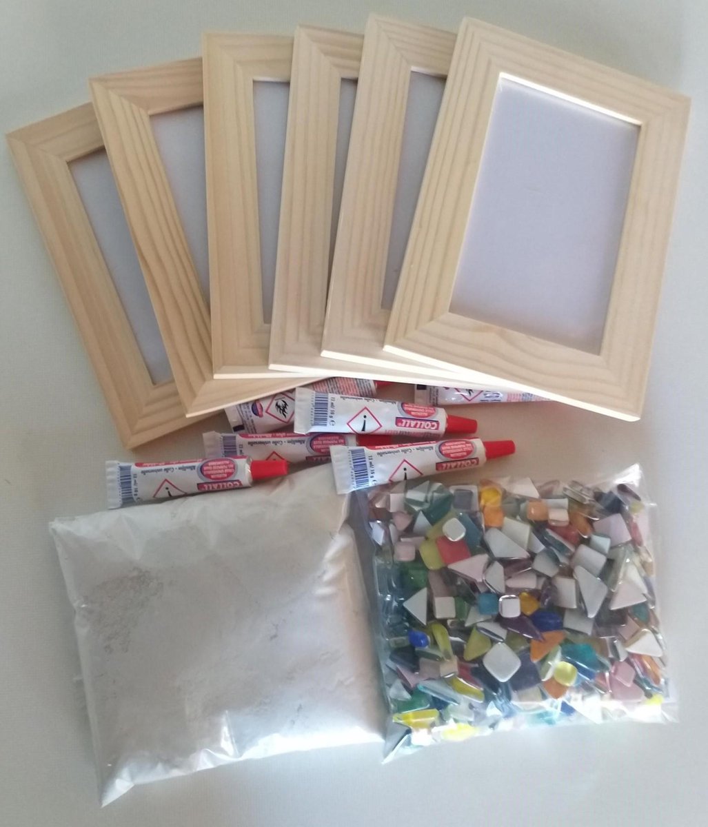 Kinderfeest Pakket Mozaïek Fotolijst Regenboog 6 stuks. Het pakket bestaat uit: 6x fotolijst 6x lijm Soft Glass Puzzles Regenboogmix Voegmiddel Leuk om te gaan doen tijdens een kinderfeestje! De 2 e foto is hoe die gaat worden!