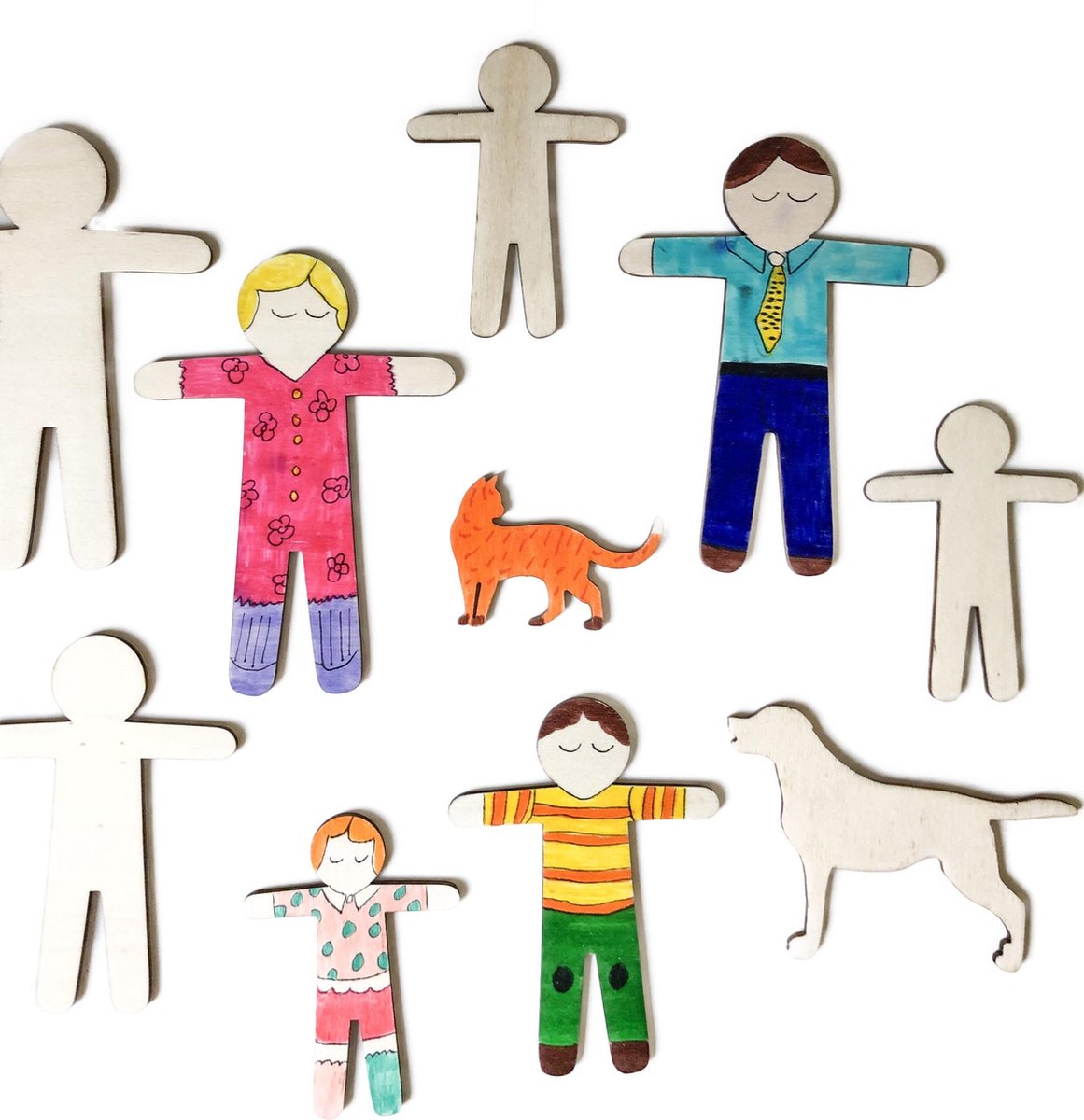 Ok kids, dit is echt voor jullie. Wat vinden jullie van dit leuke pakket vol met een houten familie. Er zitten 9 poppetjes, een hond, een kat, een konijn en nog een kleine verrassing in dit pakket. Allemaal voorzien van hun eigen standaardje zodat ze straks allemaal kunnen staan! De figuren zijn allemaal blanco dus je kunt ze naar hartelust zelf inkleuren. Gebruik je potloden, stiften of verf, alles is mogelijk. En is je familie groter dan 9 personen, geen probleem, je kunt ook de achterkant kleuren! Zo kun je een familie maken van 18 personen. Dit houdt je lekker een tijdje bezig. En is het af, dan zet je het neer of je kunt er leuk mee spelen!