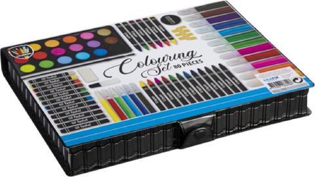 Kleur set 80 delig. SCHETSKUNST-SET: Bevat 80 onderdelen in een zachte draagtas, inclusief kleurpotloden, wasco krijtjes, olie krijtjes, waterverf, lijm, liniaal, puntenslijper en gum. DRAAGBARE OPSLAG: De tekenbenodigdheden zijn georganiseerd in een stevige Soft Case met sluiting die overal naartoe reist waar creativiteit toeslaat! HANDIG: Oefen kleur- en schetstechnieken en doe artistieke inspiratie op. CADEAU VOOR JONGENS & MEISJES: Deze kleur set is geweldig voor verjaardagen, feestdagen en dagelijkse cadeaus. VEILIG EN NIET-GIFTIG: Ideaal voor beginnende tekenaars en kinderen van 8 jaar en ouder.