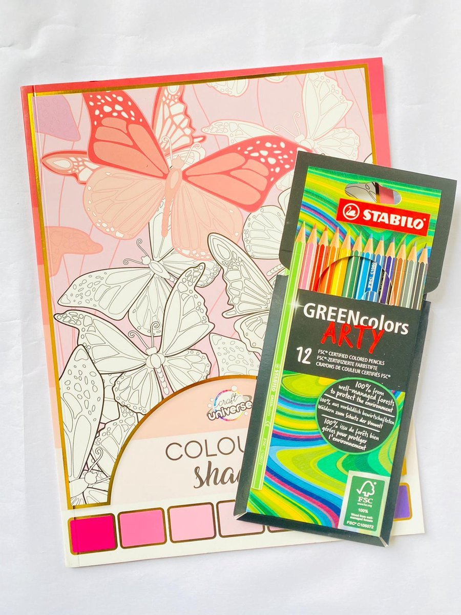 Kleurboek voor volwassen ''Vlinders' + 12 Stabilo kleurpotloden Kleurboek voor volwassen ''Vlinders'' + 12 Stabilo kleurpotloden - Schaduw Kleurboek voor volwassenen - Kleurpotloden voor volwassenen - Potloden volwassenen - Kleuren - Stiften - Kleurboek voor volwassenen bloemen Craft Universe Volwassen Kleurboek Schaduw + 12 Stabilo potloden "Even onthaasten en nieuwe energie opdoen" Met de combinatie van het kleurboek & de stabilo potloden (12 stuks) kun je meteen aan de slag. Perfect om thuis de creativiteit aan het werk te zetten. Craft Universe Schaduw Kleurboek ''Vlinders' Adult Colouring Book / Kleurboek voor volwassenen met prachtige afbeeldingen om in te vullen Bevat 40 pagina's, inclusief aangegeven kleurenpalet Het papier is 120 grams Houtvrij Offset en ook is het boek op FSC papier gedrukt. Dit maakt het boek geschikt voor zowel kleurpotloden als stiften Ook verkrijgbaar in de varianten paars, roze en groen/blauw Kom tot rust met dit kleurboek met maar liefst 40 prachtige