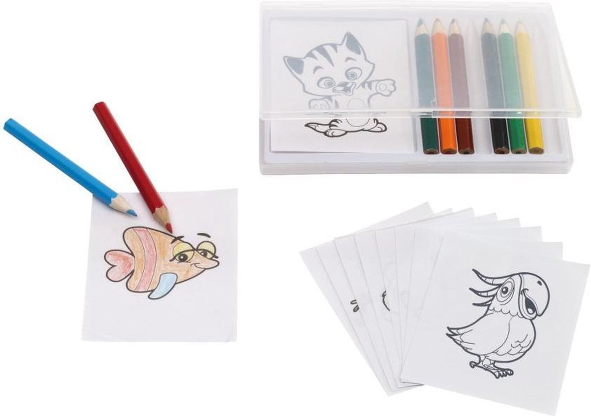 Verfset CRAZY ANIMALS: incl. 12 kleurplaten met verschillende dierenmotieven om in te kleuren, 8 gelakte kleurpotloden, geslepen, in transparante doos, kleur gekleurd, afmeting 14,7 x 10,2 x 1,2 cm