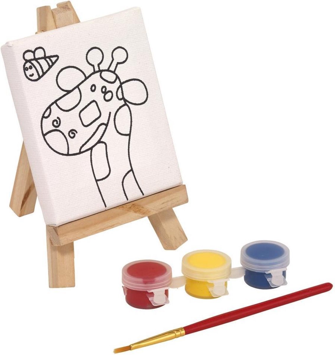 Malset borstel & SCHILDERSEZEL: canvas met motief voor het kleuren op een houten ezel, 1 borstel met 3 Wassermalfarben inbegrepen, kleur, maat 8 x 7 x 1,1 / 12,5 x7,2 cm