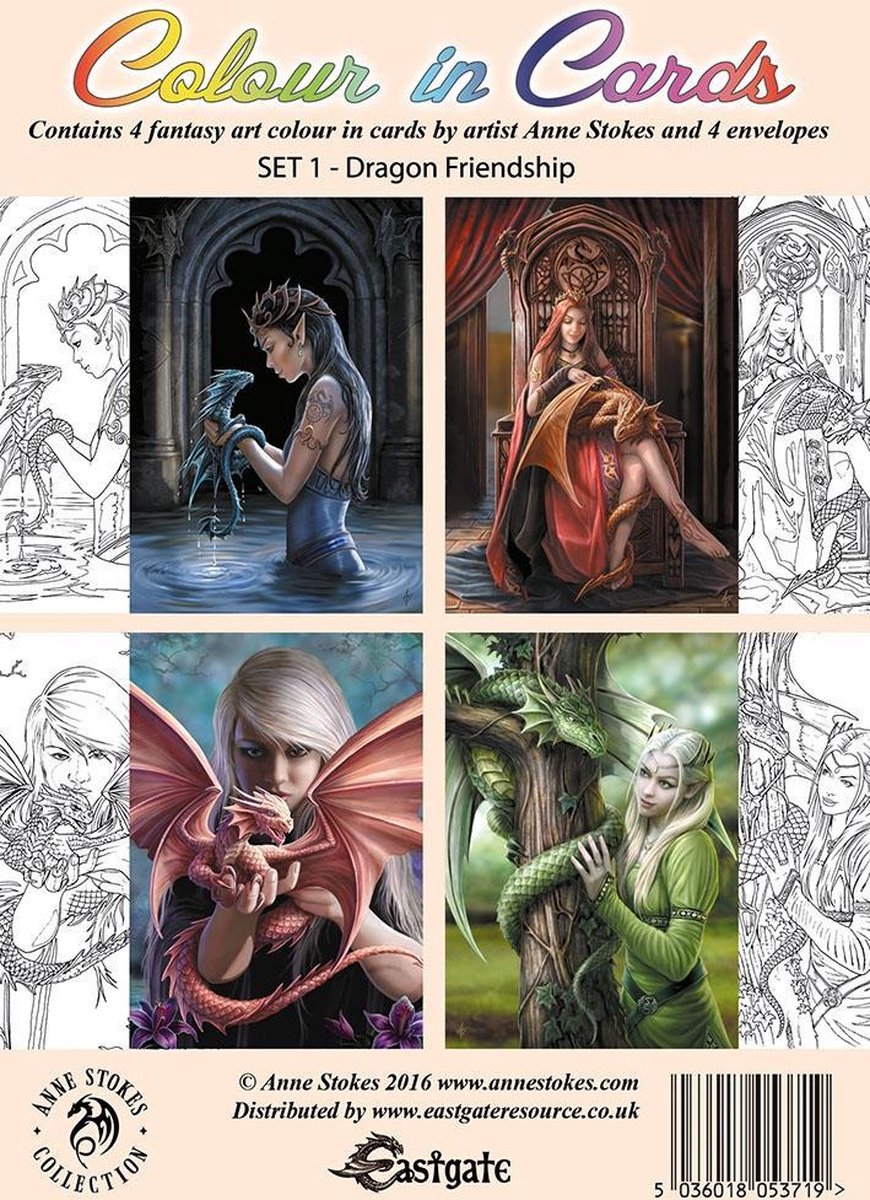 4 kaarten om in te kleuren met afbeeldingen van tekeningen van Anne Stokes. Er worden ook 4 enveloppen meegeleverd