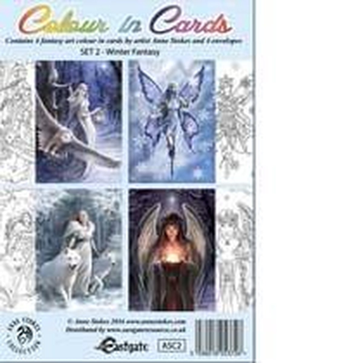 4 kaarten om in te kleuren met Kerst afbeeldingen van tekeningen van Anne Stokes set 2. Er worden ook 4 enveloppen meegeleverd