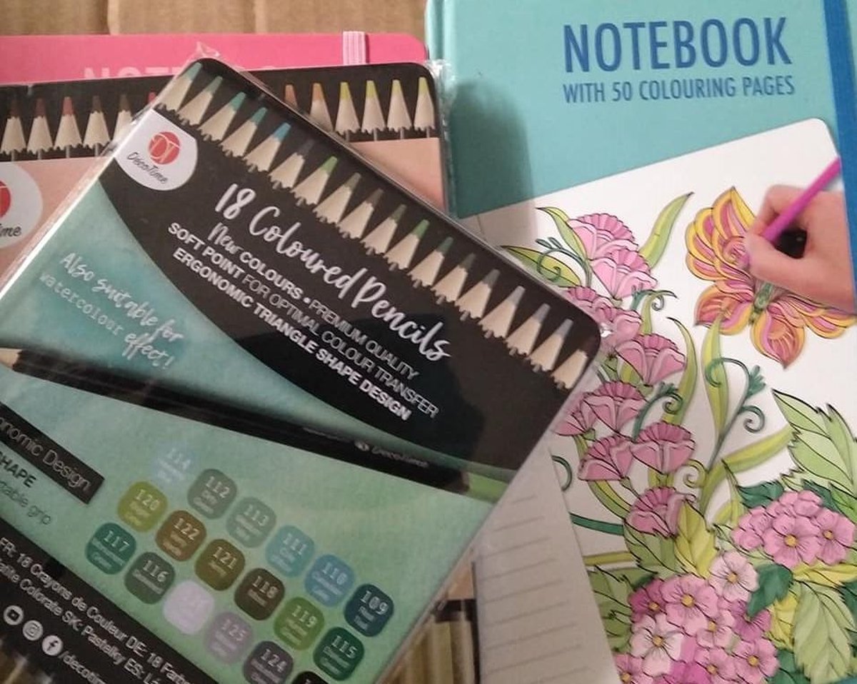 kleurpakket volwassenen 2 notebooks A5/ 120 gm2/ 50 bladen /met 50 tekeningen en 2x 18 kleurpotloden/ FSC mix papier Heb je een noteboek nodig? Je verveelt jeniet tijdens het aantekeningen maken. Totaal 100 bladzijden kleurplezier en een bezigheid dat ontstresst Met 36 kleurpotloden, variatie