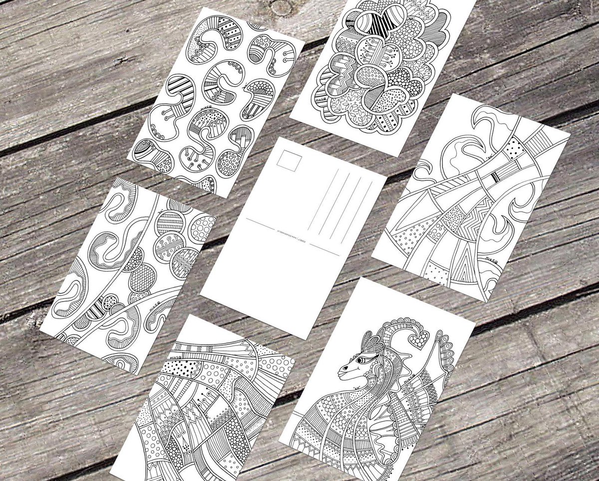 Creatieve set Ansichtkaarten. Deze set is heel abstract en geschikt om te kleuren met allerlei materialen. Ook erg leuk om te verwerken in je bujo en ajo (bulletjournal en Artjournal). Gegarandeerd uren hobby plezier voor jong en oud. Leuk om te geven en leuk om te krijgen.