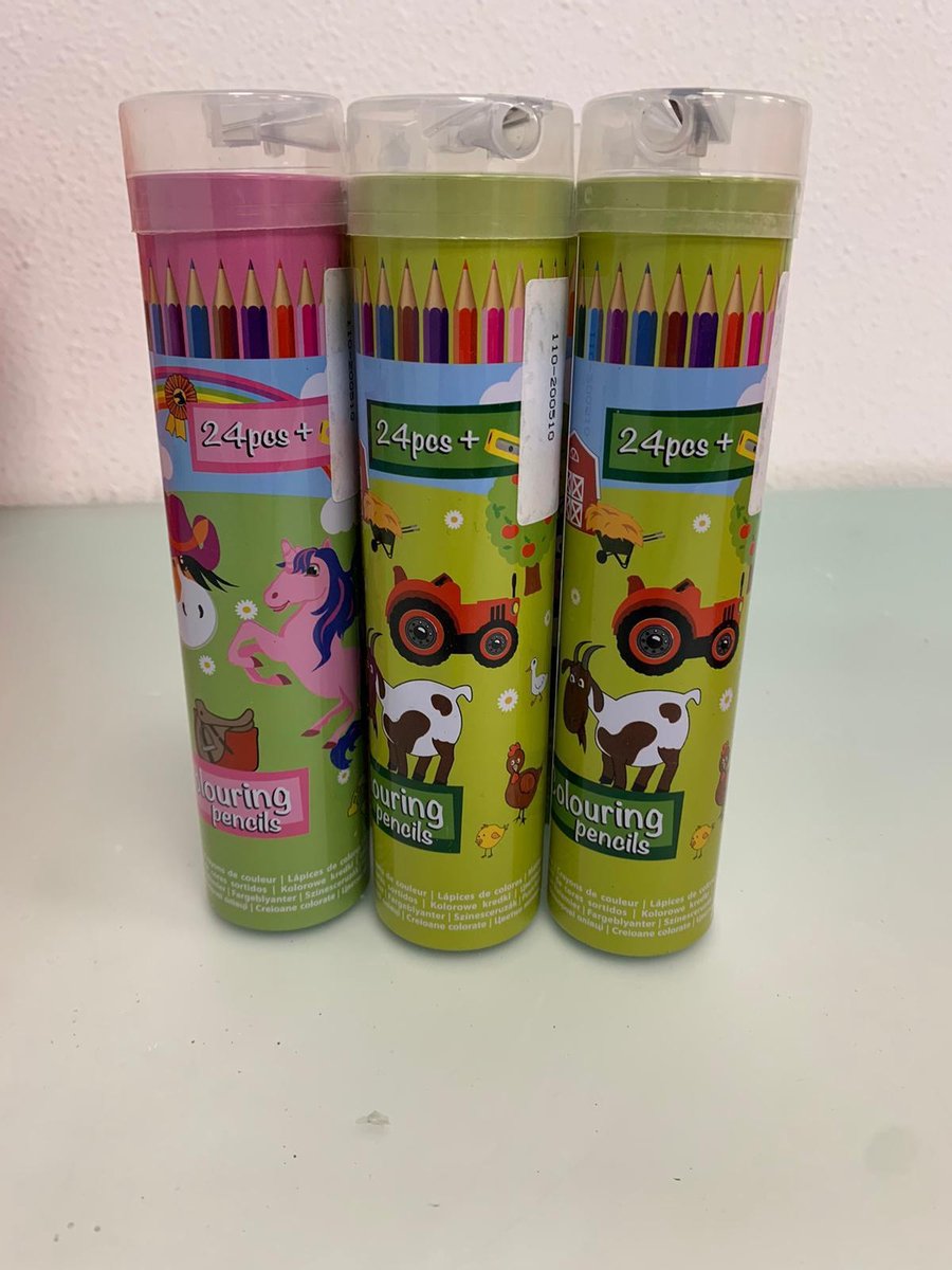 sets, 4 van boederij dieren en 1 van unicorn. overal zitten 24 potloden in.