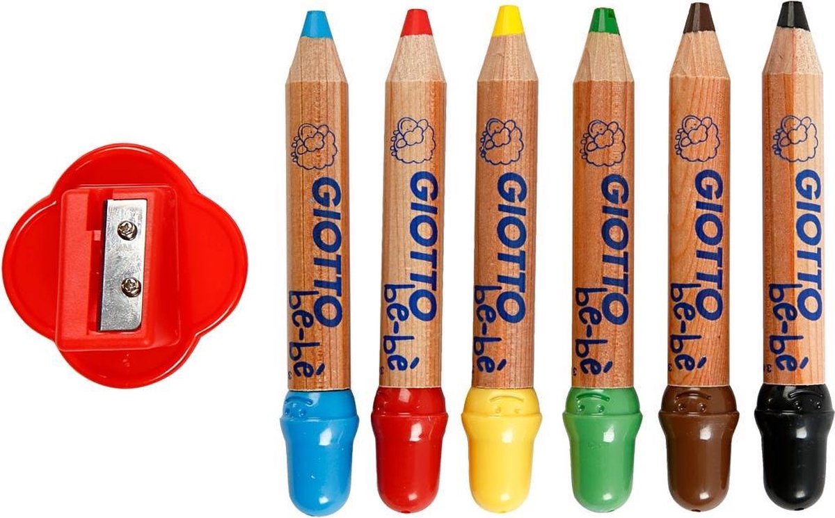 Zeer kindvriendelijke, korte, dikke potloden van Giotto Be-bè en 1 puntenslijper. Ontwikkeld en goedgekeurd voor kinderen vanaf 2 jaar.Zeer kindvriendelijke, korte, dikke potloden van Giotto Be-bè en 1 puntenslijper.