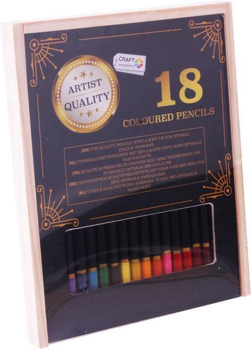 Topkwaliteit potloden met een zachte stift voor optimale kleurafgifte. Mooie kleurpotloden, er zitten 18 stuks in een houten box.