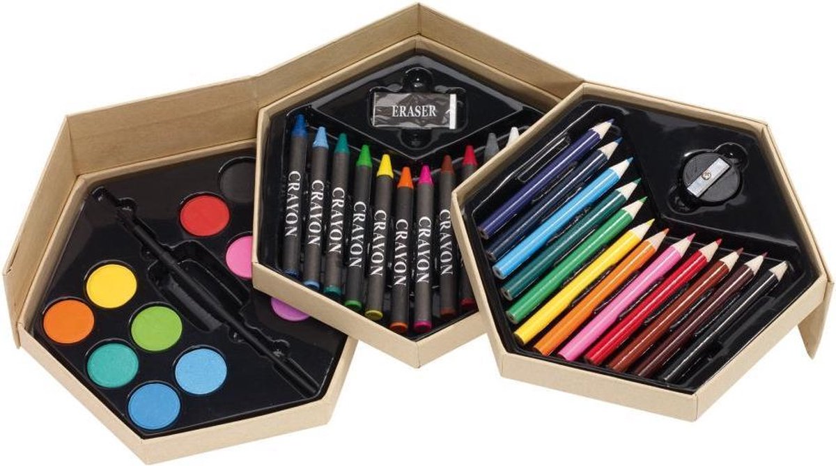 Malset "Kleurrijke Level" om uit te proberen verschillende schildertechnieken in vele kleuren :. Met 12 Wassermalfarben waaronder borstel, 12 kleurpotloden en een gum, 12 kleurpotloden (geslepen), waaronder puntenslijpers, karton in 3 verdiepingen uitvouwbare, kleur bruin, maat Ø18 x 9 x. 7 cm
