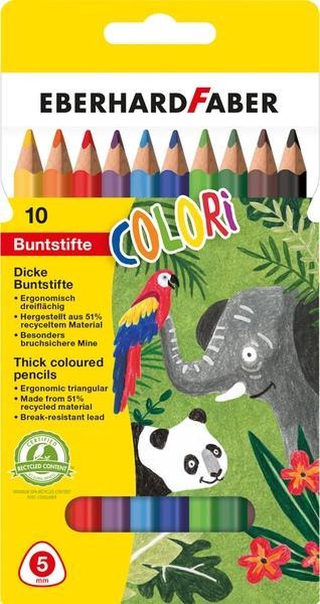 De 10 jumbo kleurpotloden zijn speciaal voor kleine kinderhandjes ontwikkeld. Door de driekantige vorm zijn ze een waardevolle hulp bij de eerste teken- en schrijfoefeningen. Geschikt voor zowel rechts- als linkshandigen. De breukvaste stift zorgt voor briljante kleuren en een bijzondere soepele kleurafgave. Het potlood is houtvrij. De diameter van dit potlood is 5mm.