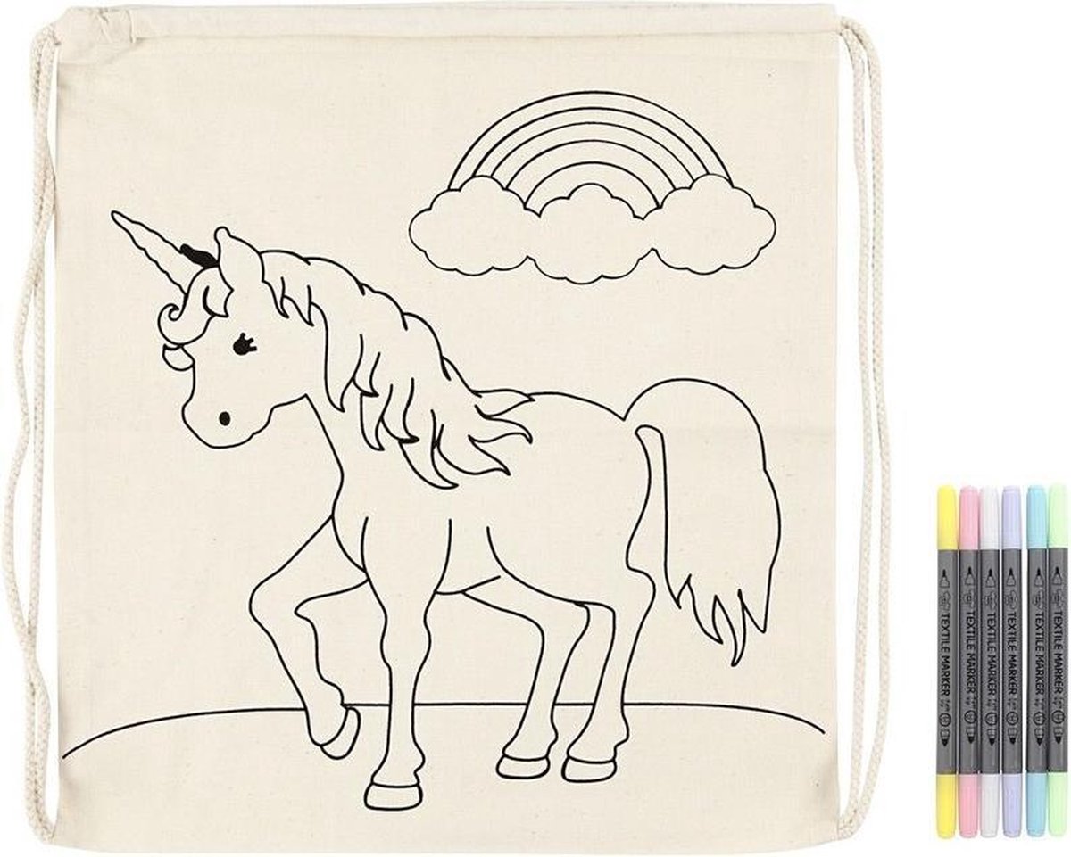 Een naturelkleurig rugtasje met daarop een sjabloon van een eenhoorn met een regenboog, enkelzijdig bedrukt. Materiaal: 100% katoen. Afmeting: ca. 37 x 41 cm. Met trekkoord sluiting. Word geleverd incl. 6 pastelkleuren textielstiften. Ivm eventueel doordrukken raden wij aan een krant in de tas te stoppen voor het kleuren. De kleuren worden permanent (gefixeerd) door een stukje bakpapier er op te leggen en de strijkijzer er overheen te halen. Hierna kunt u het textiel wassen op max. 40 graden. bestaande uit 1x Inkleurbaar rugzakje eenhoorn 41 cm, 1x 6x Pastel kleuren textielstiften 2-punten