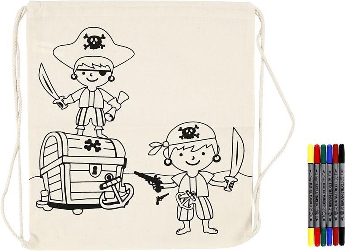 Een naturelkleurig rugtasje met daarop een sjabloon van 2 piraten met een schatkist, enkelzijdig bedrukt. Materiaal: 100% katoen. Afmeting: ca. 37 x 41 cm. Met trekkoord sluiting. Word geleverd incl. 6 kleuren textielstiften. Ivm eventueel doordrukken raden wij aan een krant in de tas te stoppen voor het kleuren. De kleuren worden permanent (gefixeerd) door een stukje bakpapier er op te leggen en de strijkijzer er overheen te halen. Hierna kunt u het textiel wassen op max. 40 graden. bestaande uit 1x Inkleurbaar rugzakje piraat 41 cm, 1x 6x Standaard kleuren textielstiften 2-punten