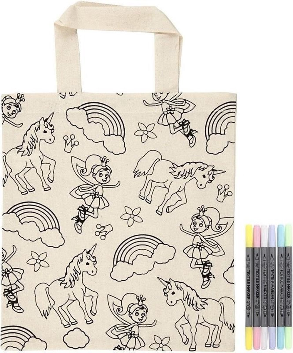 Een naturelkleurig tasje met daarop een sjabloon van eenhoorns met regenbogen en elfjes, enkelzijdig bedrukt. Materiaal: 100% katoen. Afmeting: ca. 27 x 30 cm. Word geleverd incl. 6 pastelkleuren textielstiften. Ivm eventueel doordrukken raden wij aan een krant in de tas te stoppen voor het kleuren. De kleuren worden permanent (gefixeerd) door een stukje bakpapier er op te leggen en de strijkijzer er overheen te halen. Hierna kunt u het textiel wassen op max. 40 graden. bestaande uit 1x Inkleurbaar tasje eenhoorns 30 cm, 1x 6x Pastel kleuren textielstiften 2-punten