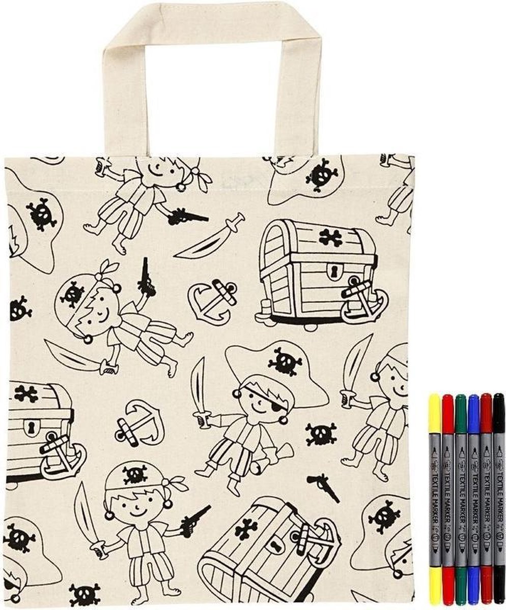 Een naturelkleurig tasje met daarop een sjabloon van piraten met schatkisten, enkelzijdig bedrukt. Materiaal: 100% katoen. Afmeting: ca. 27 x 30 cm. Word geleverd incl. 6 gekleurde textielstiften. Ivm eventueel doordrukken raden wij aan een krant in de tas te stoppen voor het kleuren. De kleuren worden permanent (gefixeerd) door een stukje bakpapier er op te leggen en de strijkijzer er overheen te halen. Hierna kunt u het textiel wassen op max. 40 graden. bestaande uit 1x Inkleurbaar tasje piraten 30 cm, 1x 6x Standaard kleuren textielstiften 2-punten