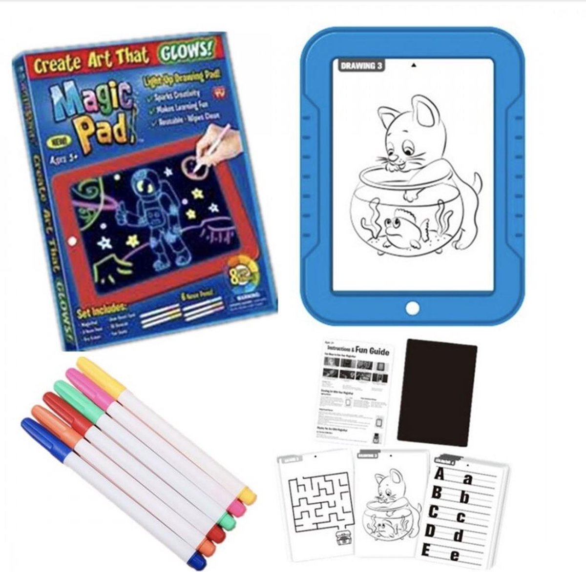 Met deze Magische blauwe Pad maak je geweldige creaties! Door de bijgeleverde sjablonen is het heel eenvoudig om te leren tekenen, kleuren, rekenen, schrijven en nog veel meer! Met de speciaal bijgeleverde neon stiften in verschillende schitterende kleuren, straalt de creatie fantastisch als de Magische Pad aanstaat! Liever opnieuw beginnen? Geen probleem! Met één eenvoudige handbeweging is de creatie van deze Magische Pad te vegen en is deze klaar voor de volgende prachtige tekening. Deze Magische Pad heeft een handige standaard, waarmee de creaties eenvoudig rechtop kunnen worden gezet. Zo kan iedereen van de creatie genieten! Klaar met tekenen? Berg de bijgeleverde stiften eenvoudig op onder de Magische Pad. Tip: last van uitgedroogde stiften na verloop van tijd? Doop het puntje van de stift voor 30 seconde in een beetje alcohol! ? 3 dubbele neon stiften met 6 fantastische kleuren ? Vijftien sjablonen om te leren tekenen, kleuren, rekenen, schrijven en meer ? Een