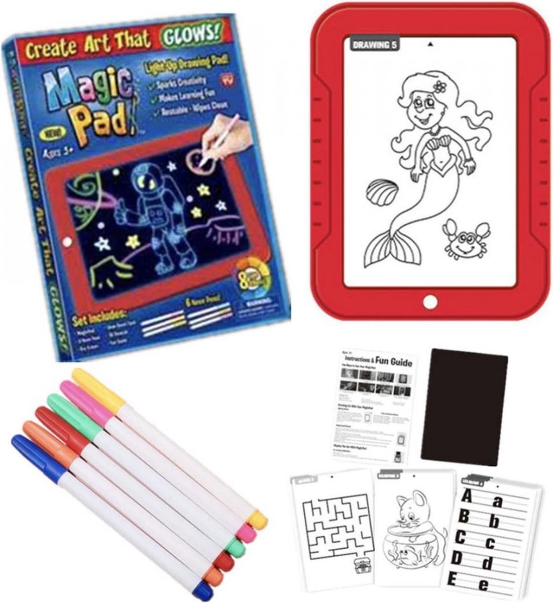 Met deze Magische rode Pad maak je geweldige creaties! Door de bijgeleverde sjablonen is het heel eenvoudig om te leren tekenen, kleuren, rekenen, schrijven en nog veel meer! Met de speciaal bijgeleverde neon stiften in verschillende schitterende kleuren, straalt de creatie fantastisch als de Magische Pad aanstaat! Liever opnieuw beginnen? Geen probleem! Met één eenvoudige handbeweging is de creatie van deze Magische Pad te vegen en is deze klaar voor de volgende prachtige tekening. Deze Magische Pad heeft een handige standaard, waarmee de creaties eenvoudig rechtop kunnen worden gezet. Zo kan iedereen van de creatie genieten! Klaar met tekenen? Berg de bijgeleverde stiften eenvoudig op onder de Magische Pad. Tip: last van uitgedroogde stiften na verloop van tijd? Doop het puntje van de stift voor 30 seconde in een beetje alcohol! ? 3 dubbele neon stiften met 6 fantastische kleuren ? Vijftien sjablonen om te leren tekenen, kleuren, rekenen, schrijven en meer ? Een schoonmaakdoekje