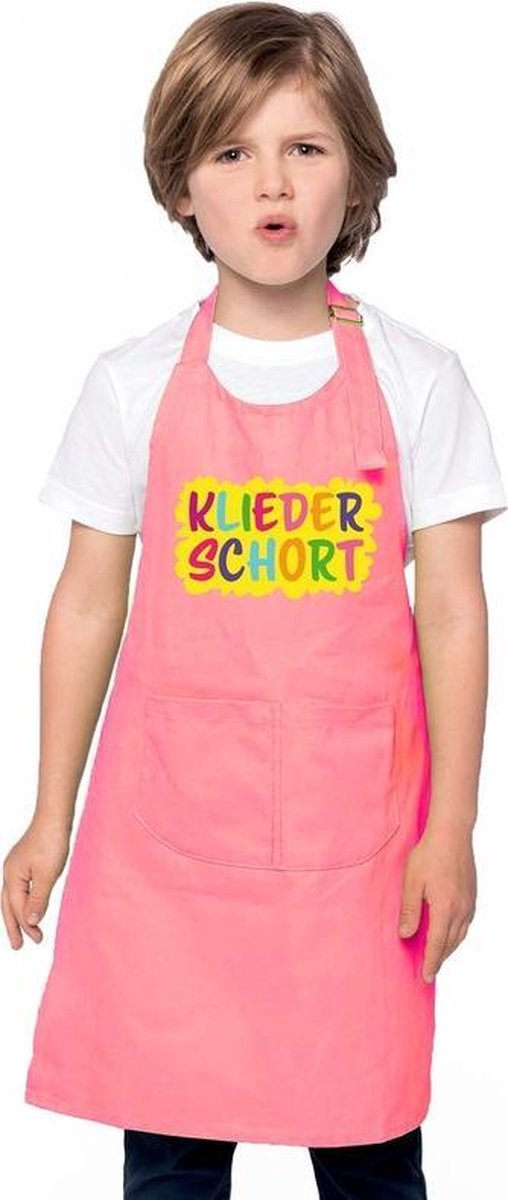 Kliederschort roze voor jongens en meisjes. Op dit schort staat groot kliederschort in vrolijke letters. Leuk schort voor echte kliederkonten. Dit schort voor kinderen is verstelbaar doormiddel van een metalen sluiting aan de hals. Het schort bevat een grote zak aan de voorkant met 2 vakken. Afmeting: 60 x 44 cm. Materiaal: 100% katoen. Kwaliteit: 280 grams.