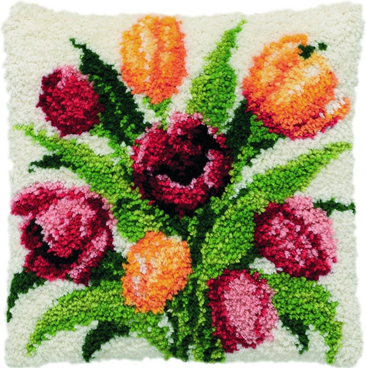 Knoopkussen rode en gele tulpen van Pako. afm:40x40 cm. Incl Handgeschilderd stamien, voorgesneden knoopdraad, nederlandstalige werkwijze excl knoophaak.