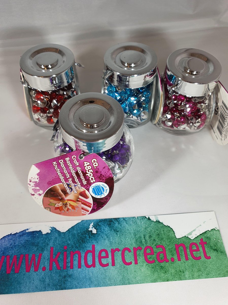 Verschillende potjes met knutseldiamanten in verschillende kleuren. Met de 485 stuks, kun je echt eindeloos knutselen! Prijs per stuk(potje), verschillende uitvoeringen/kleuren worden door elkaar geleverd. ze zitten in leuke potjes. bij meer potjes krijgt u een leuke korting.