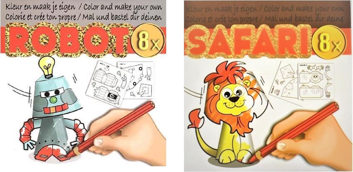 Knutsel & Teken set Leuke knutsel set met twee figuren: De Leeuw en de Robot. Inkleuren en vouwen. Elke set heeft 8 inkleur figuren (16 vel) + instructie vel U ontvangt: De leeuw en de Robot, beide apart verpakt