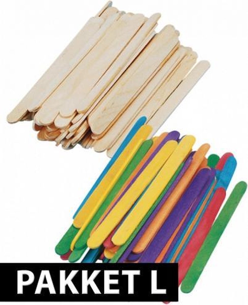 Knutselhoutjes pakket. Pakket met blanco en gekleurde houten stokjes met een formaat van 110 x 11 mm. U ontvangt 5 x 72 blanco houtjes en 2 x 72 gekleurde houtjes. Te gebruiken voor diverse doeleinden, zoals bijvoorbeeld het maken van een poppenhuisvloer. bestaande uit 5x Knutselhoutjes 72 stuks, 2x Gekleurde knutselhoutjes 72 stuks