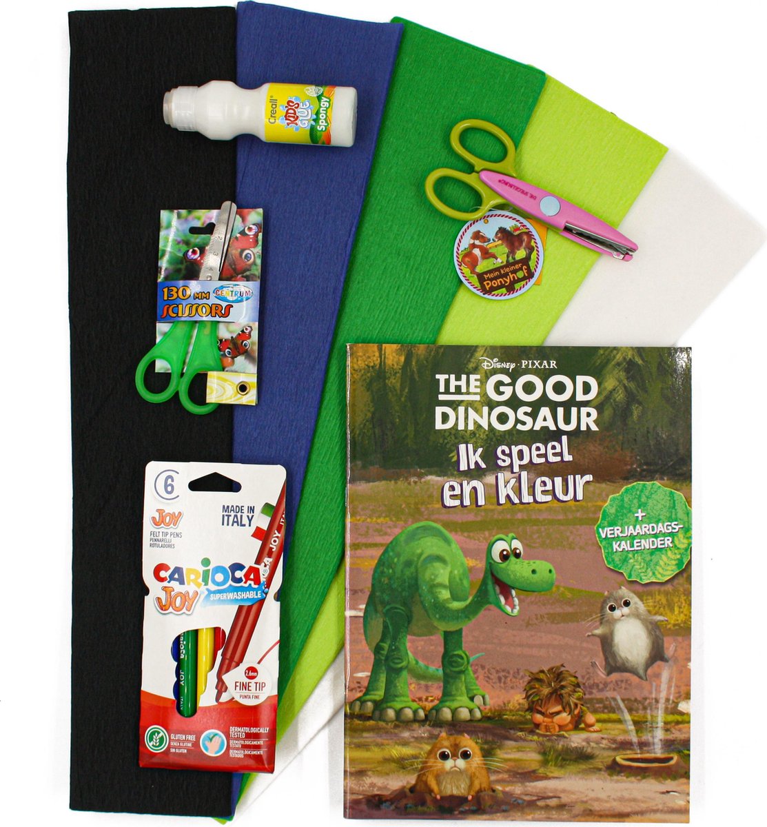 Wij hebben een fantastisch mooi knutselpakket voor jou samengesteld. 10 delig ! Gemaakt voor de koude wintermaanden en de regenachtige dagen. Hiermee ben je uren zoet. Maakt je eigen creatie voor uren lang plezier. In deze set is inbegrepen: Kinderlijm met sponsje, vanaf 3 jaar Stompe kinderschaar The good Dinosaur ( Pixar-Disney) kleurboek 72x Kleur stiften Knutselcrêpepapier 50 cm x 2.50 cm, 5 kleuren kartelschaartje , met pony motief !