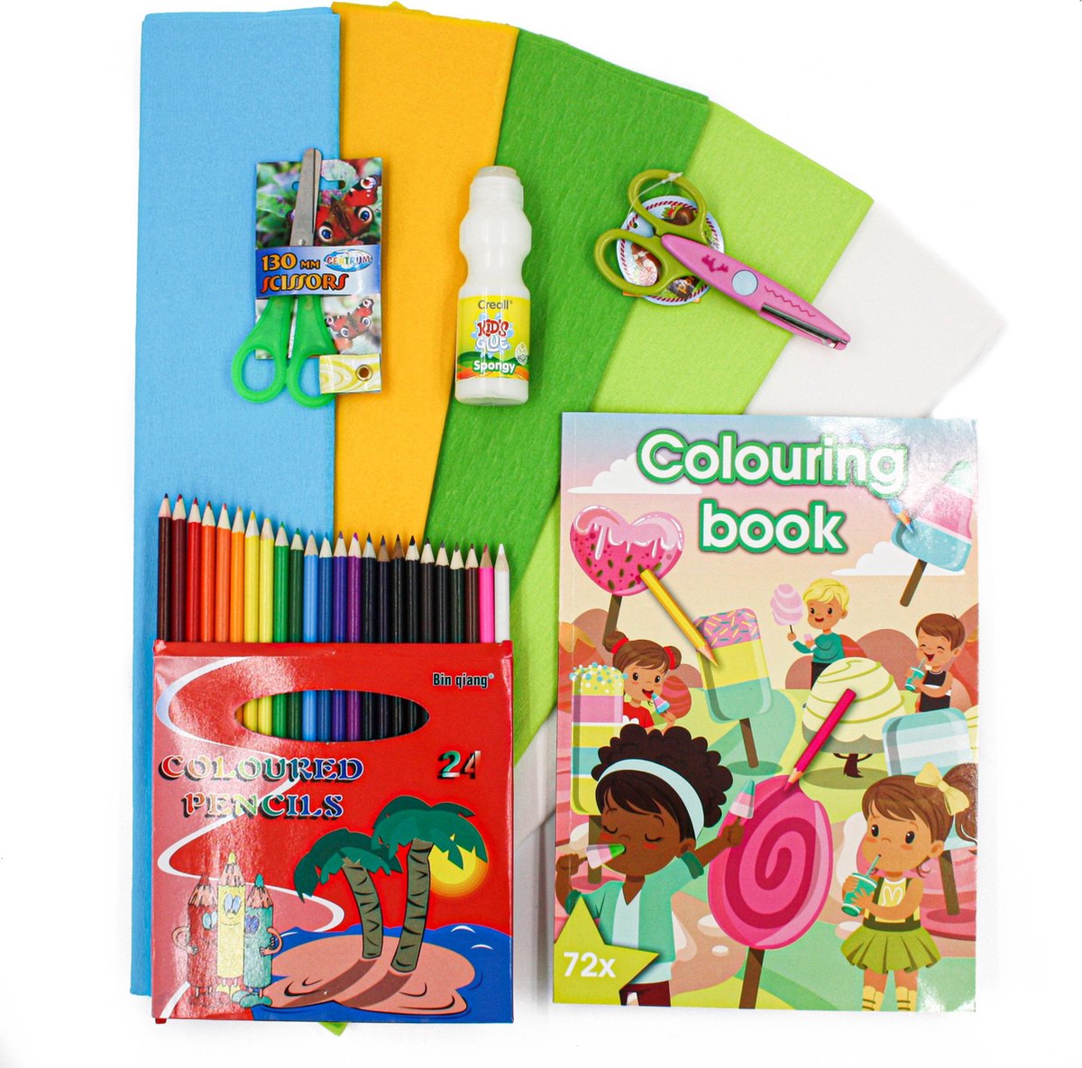 Wij hebben een fantastisch mooi knutselpakket voor jou samengesteld. 10 delig ! Gemaakt voor de koude wintermaanden en de regenachtige dagen. Hiermee ben je uren zoet. Maakt je eigen creatie voor uren lang plezier. In deze set is inbegrepen: Kinderlijm met sponsje, vanaf 3 jaar Stompe kinderschaar kleurboek 72x Kleurpotloden 24 stuks Knutselcrêpepapier 50 cm x 2.50 cm, 5 kleuren kartelschaartje , met pony motief !