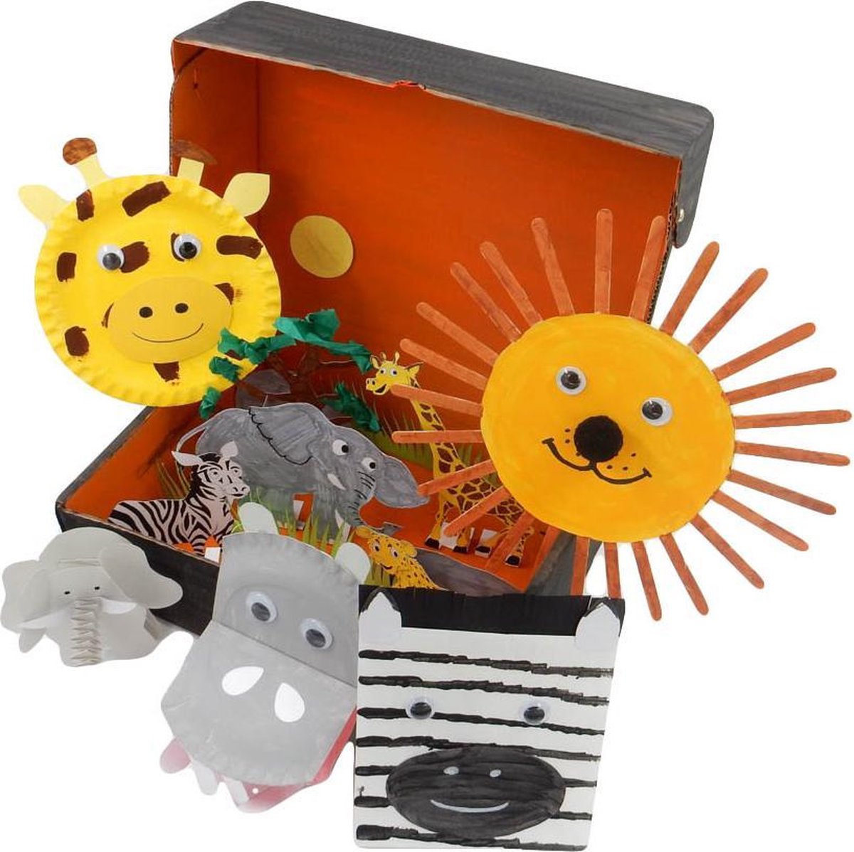 Leuke knutselpakket met als thema de safari! De knutselpakketten zijn bedoeld voor kinderen vanaf 3 jaar. In het pakket zit (bijna) alles om de knutselwerkjes te kunnen maken. Het enige wat je nodig hebt is een schaar en lijm In het S pakket zitten de volgende leuke knutselwerkjes: - Giraffe - Nijlpaard - Zebra - Olifant -Flamingo -Verrekijker -Leeuw -Kijkdoos