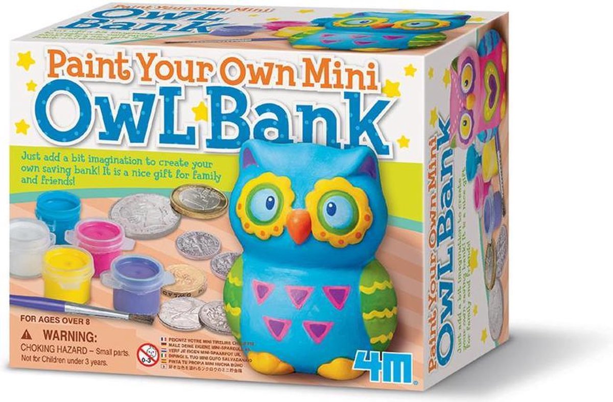 4M Crea: spaarpot schilderen Maak jouw eigen spaarpot in de vorm van een uil met deze super leuke set. Beschilder de uil met de mooiste kleurtjes. Wat is er leuker dan jouw eigen spaarpot schilderen? Specificaties: Kleur: multicolor Materiaal: gips, kunststof Geslacht: junior Afmetingen uil: 6 x 6 x 8 cm Geschikt voor kinderen vanaf 8 jaar. Inhoud: 1 Spaarpot 1 Set met verf 1 Kwast