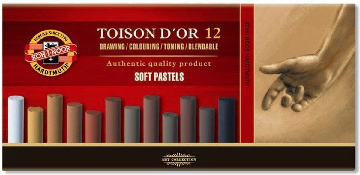 Set of 12 powdery brown pastels with a wrap, diameter of 10 mm and length of 75 mm. They are suitable for drawing natural sceneries. When drawing, it is possible to use a pastel holder KOH-I-NOOR Versatil. Once finished, we recommend to stabilize the drawing with a fixative.