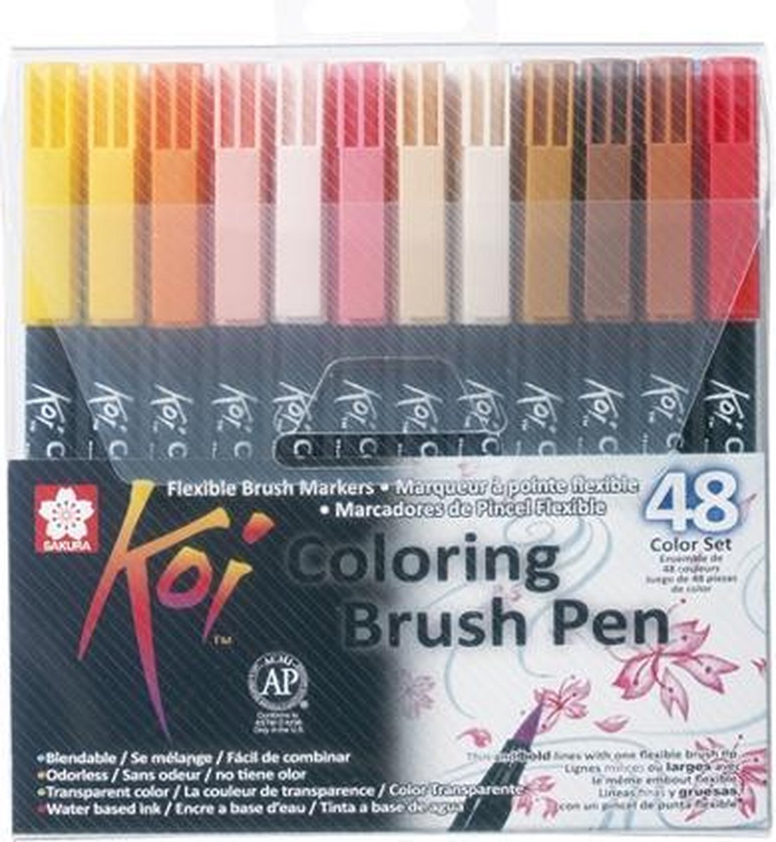 Met Sakura Koi Coloring Brush Pens kun je eenvoudig levendige kleuren toevoegen aan iedere schets, tijdschrift, cartoon, illustratie en stempel. De 48 transparante inktkleuren mengen gemakkelijk, zodat je een veelheid aan kleuren en effecten kunt bewerkstelligen.