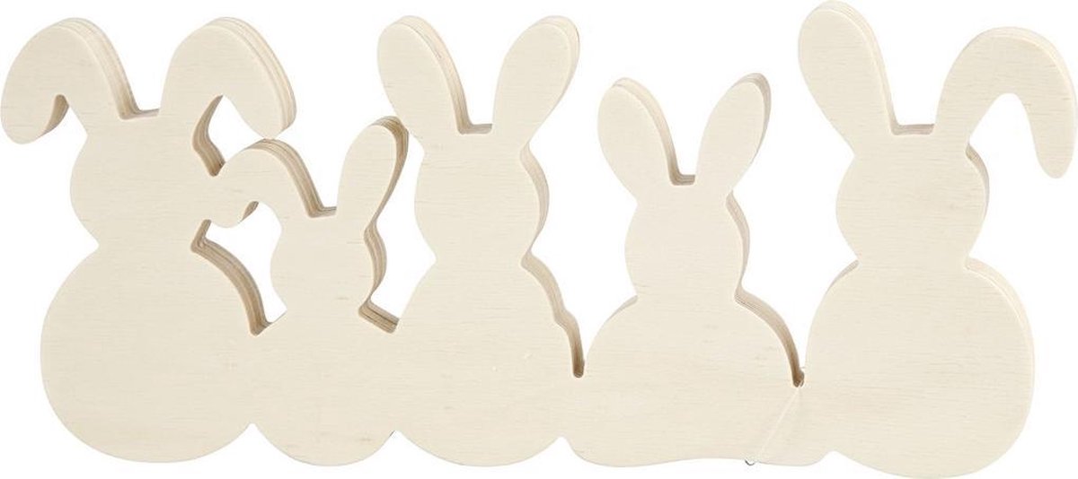Vijf konijnen aan elkaar van licht hout. Figuur kan zelfstandig staan.