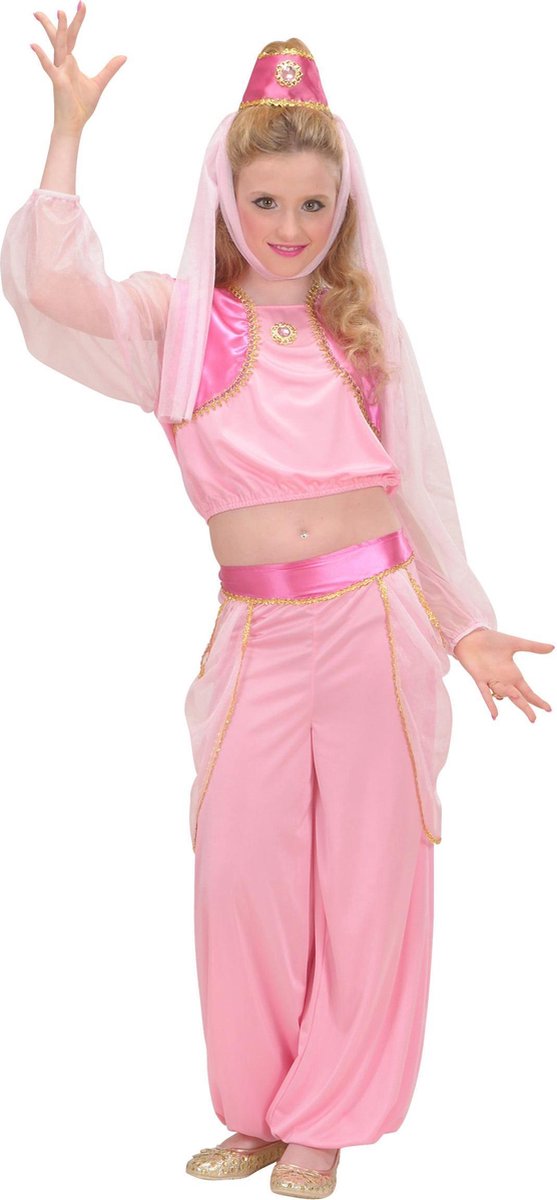"Kostuum geest uit de wonderlamp voor meisjes - Dit kostuum van geest uit de lamp voor meisjes bestaat uit een roze pofbroek met elastische taille, een bovenstuk met mouwen in doorzichtige voile en kort ingewerkt vestje met bijpassend hoofddeksel dat met een lintje bevestigd wordt (Schoenen niet inbegrepen). Dit kostuum is ideaal voor een verkleed verjaardagsfeestje, een show of carnaval. © Copyright Widmann SRL ?."