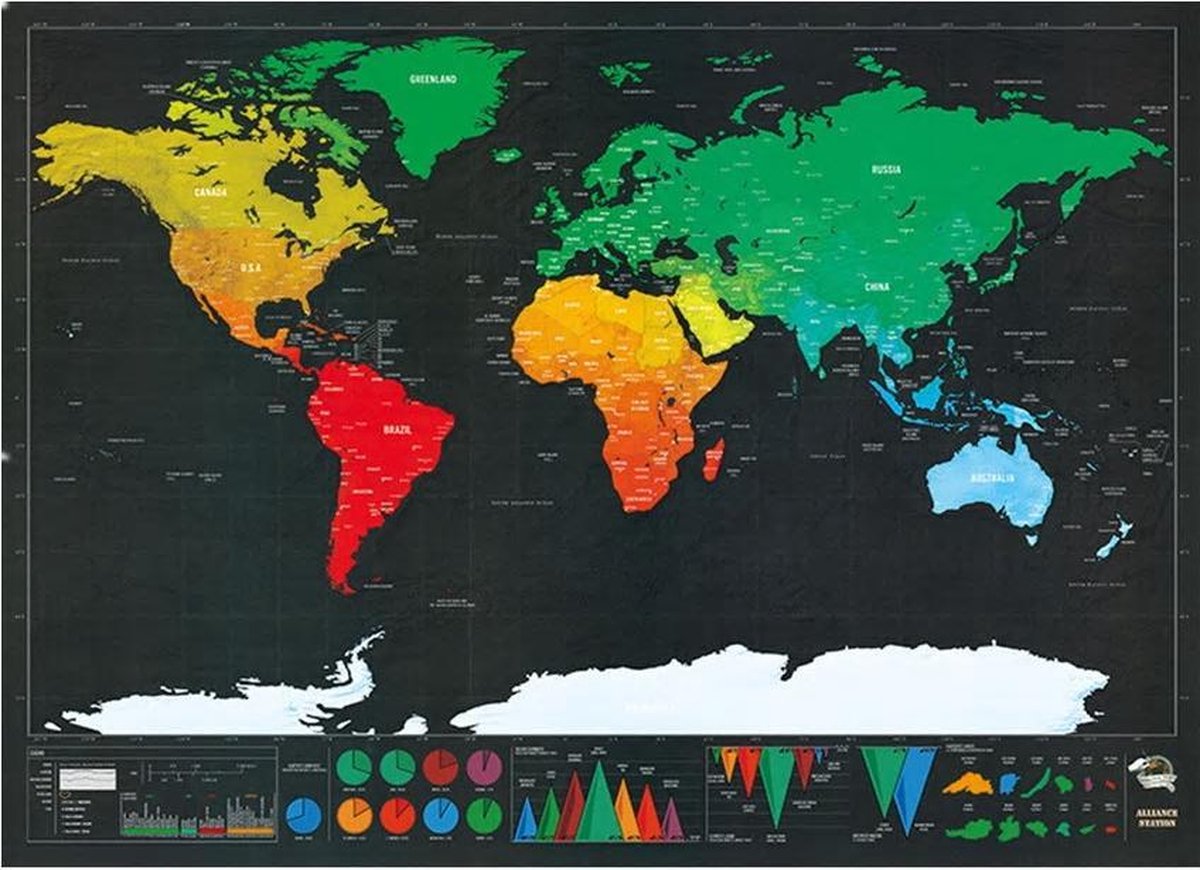 Krastekening van de wereldkaart. De krastekening is 30x40cm groot en bied genoeg krasplezier. De tekening wordt opgerold geleverd, voordat u er aan begint is het aan te raden de tekening even onder een paar boeken te leggen zodat hij vlak wordt. U kunt de vlakken open krassen met een muntje, een krashoutje (niet meegeleverd) of kijk eens naar onze kras tekening toolkit deluxe.