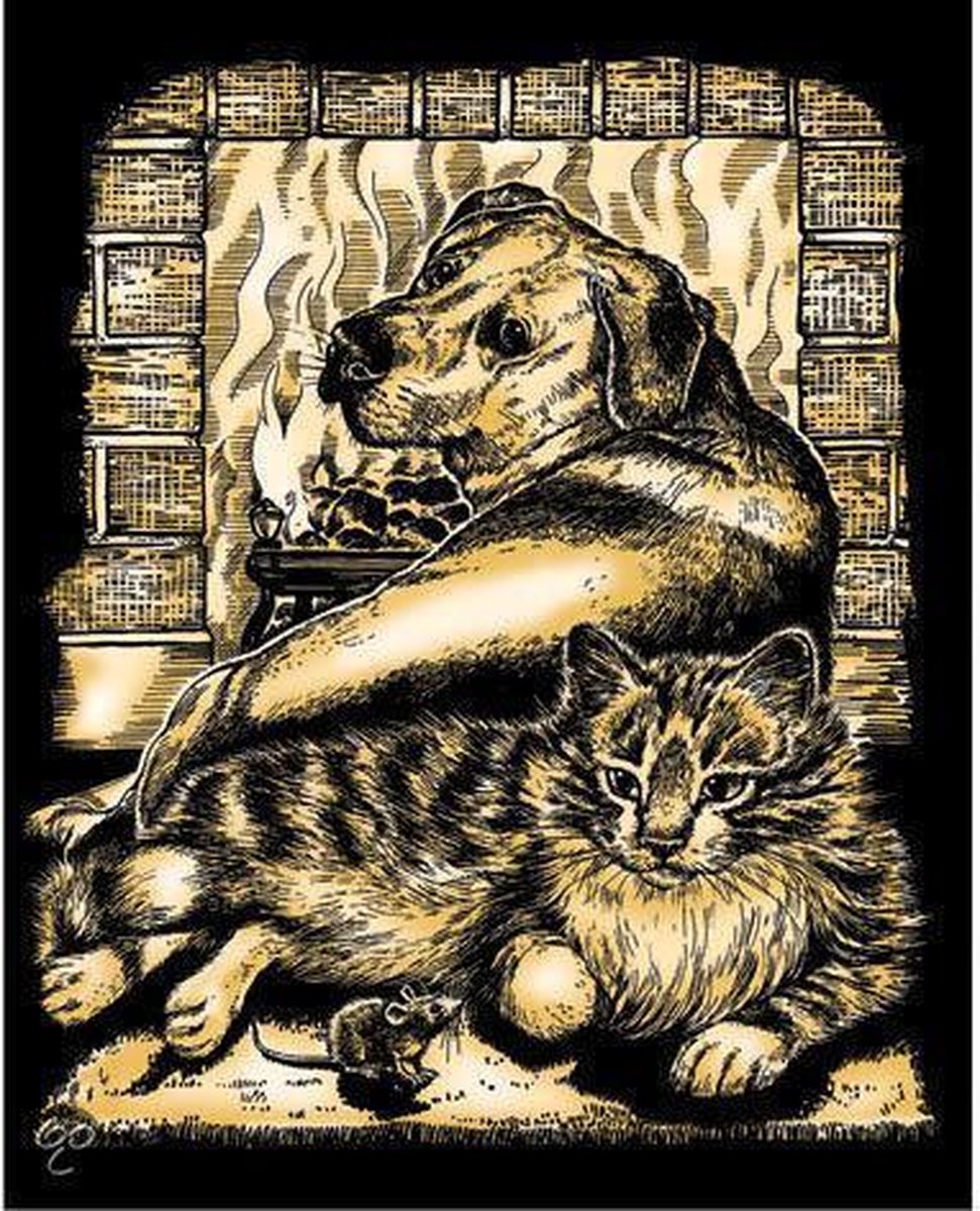 Als je over het zwarte oppervlak over de grijze lijnen krast, komt langzaam de prachtige afbeelding van de gouden hond tevoorschijn. Voor de fijne lijnen gebruik je de punt van de kraspen, voor de grotere stukken gebruik je de zijkant. Inhoud: 1 voorbedrukt vel met de grijze lijnen, 1 krasblad en een kraspen. Afmeting: 204 x 255 mm.