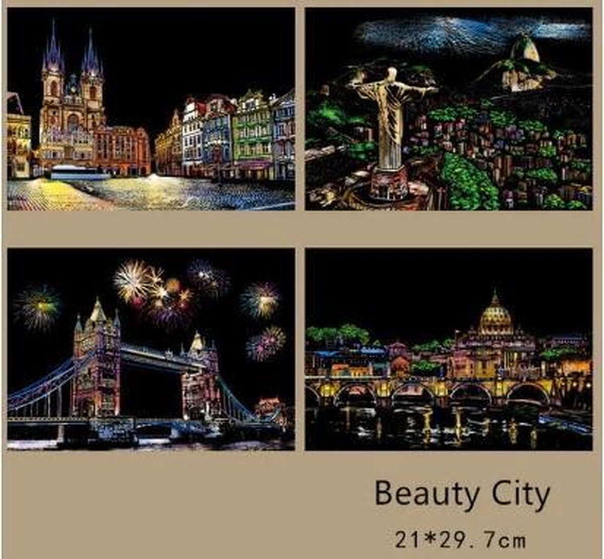 Mooie kleurrijke krastekeningen set Beauty City. Maak de mooiste en kleurrijkste schilderijen voor in huis. Het pakket bevat 4 schilderijen van ieder 21x29cm groot. De kras tekeningen worden geleverd als een zwart blad met grijze vlakken er op, deze grijze vlakken dient u weg te krassen met de bijgeleverde kraspen waardoor de kleurrijke afbeelding zichtbaar wordt. Inhoud: - 4 Kleurrijke Krastekeningen - 1 Kraspen