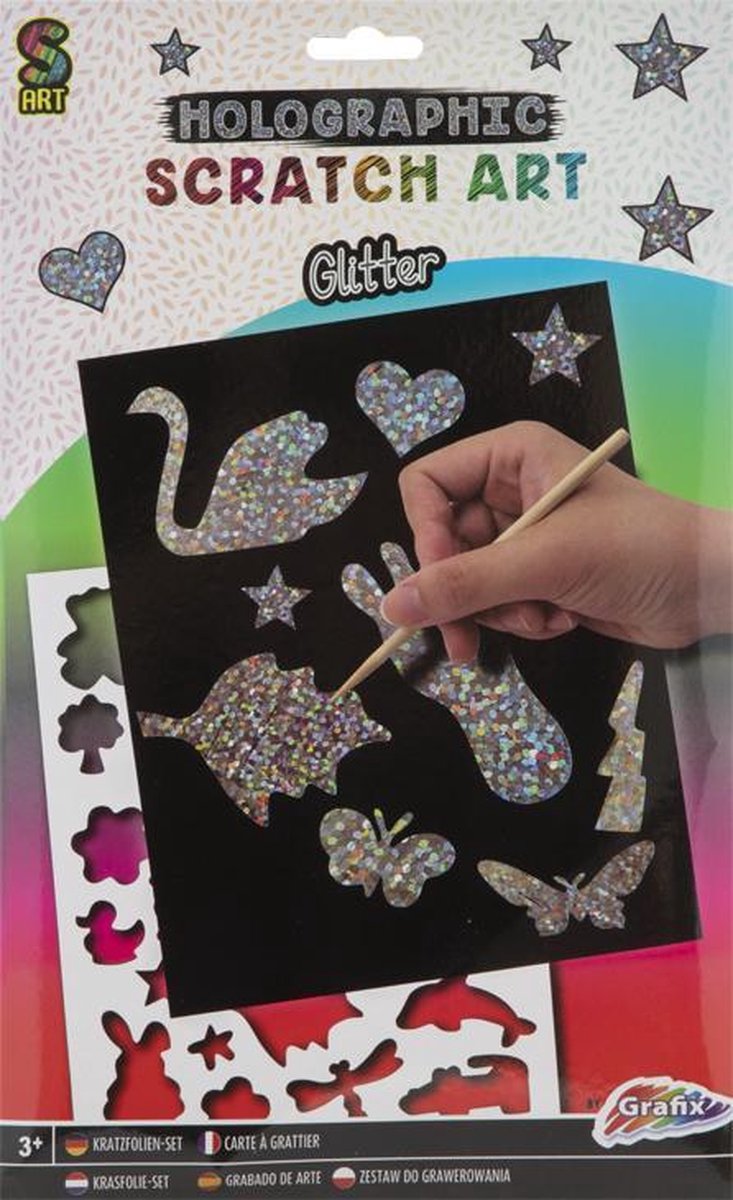 De nieuwste trend van het moment: met de Grafix Krastekeningen beleven je kinderen uren krasplezier. Neem de houten pen in je hand en laat stukje per stukje 4 prachtige kuntswerken in het thema Glitter verschijnen. Scratch painting is bijzonder kalmerend en ontstressend, neem de houten pen in je hand en je bent in een andere wereld. Pakket: - 4 Kras tekening Glitter (18 x 14 cm) - 1 Houten Kraspen - 1 stencil met diverse symbolen om uit te krassen - 4 houders om krastekening ten toon te stellen