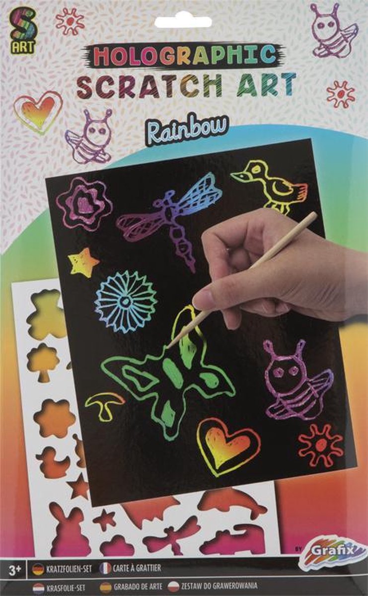De nieuwste trend van het moment: met de Grafix Krastekeningen beleven je kinderen uren krasplezier. Neem de houten pen in je hand en laat stukje per stukje 4 prachtige kuntswerken in het thema regenboog verschijnen. Scratch painting is bijzonder kalmerend en ontstressend, neem de houten pen in je hand en je bent in een andere wereld. Pakket: - 4 Kras tekening met regenboog kleuren (18 x 14 cm) - 1 Houten Kraspen - 1 stencil met symbolen om uit te krassen - 4 houders om tekeningen ten toon te stellen