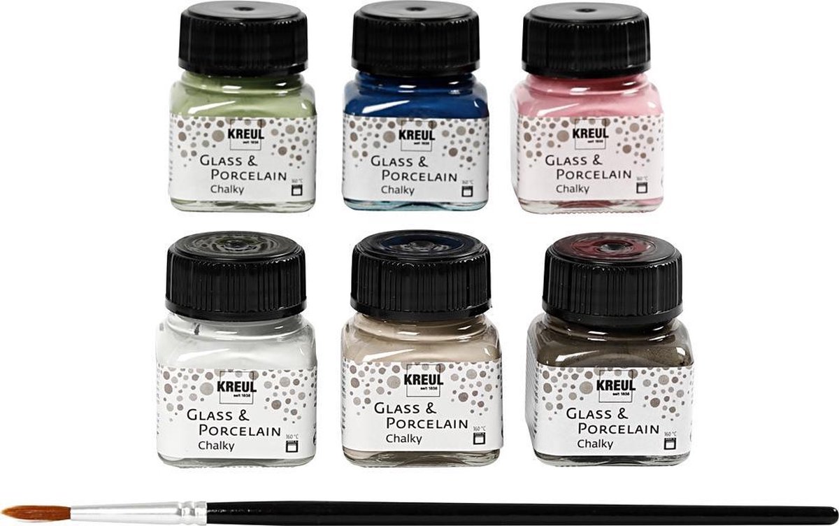 Glanzende, dekkende verf op waterbasis voor artikelen van porselein, terracotta en glas. Set met 6 sterke kleuren en 1 kwast.