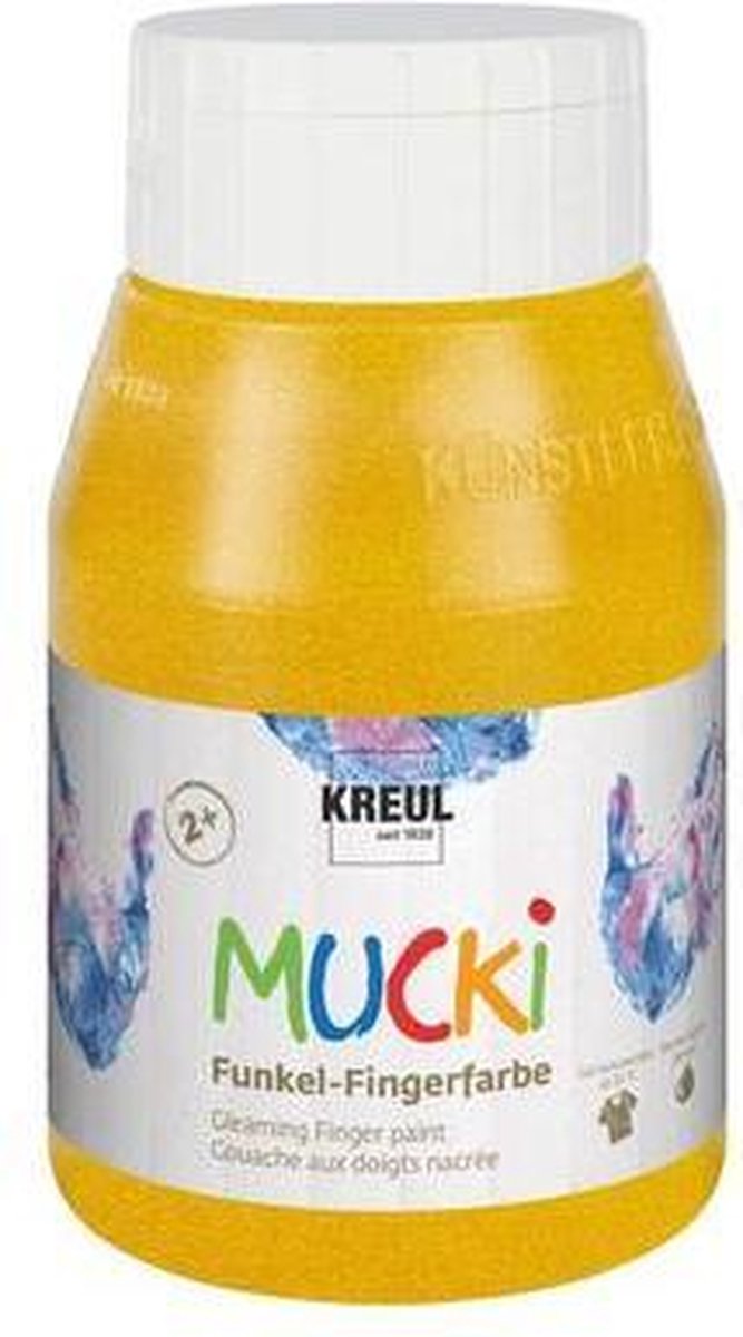 Kreul Glitter Finger Paint "Mucki" pot met goud, 500 ml Waterbasis gemakkelijk verwerk, ondoorzichtige, waterverdunbaar, gemengd met elkaar, wasbaar 30 graden, voor het tekenen op papier, karton, doek, hout, Steen, terra cotta, glas, in plastic doosje (23225) inhoud: 500 ml Kleur goud.