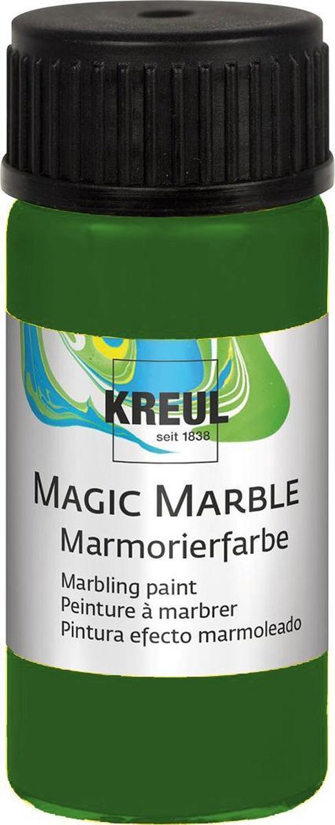 Deze Magic Marble verf van Kreul Hobby Line voorziet elk oppervlak van een uniek marble effect. De toepassingen zijn eindeloos, van gitaren, tot achtergronden van schilderijen. Deze verf is geschikt voor diverse ondergronden zoals hout, karton, metaal, porcelein, kaarsen, etc. Eigenschappen: - droogt snel - matte afwerking - hersluitbaar glazen potje van 20ml - 17 kleurtinten Hoe werkt het? De verf wordt vanuit het potje in een waterbad gedruppeld, eventjes doorroeren, het voorwerp onderdompelen en klaar is kees! Magic Marble is verkrijgbaar in meer dan 30 schitterende kleuren, waaronder ook 2 glittertinten, 4 metallic kleuren, 3 neon kleuren en 4 matte tinten. Verkrijgbaar in glazen potjes van 20 ml met druppelinzet voor eenvoudig en nauwkeurig werken.