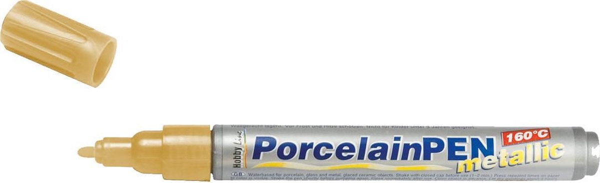 Deze Hobby Line Porcelain Pen is een glas- en porseleinstift op waterbasis en geschikt voor glas, porselein, metaal en keramiek. De marker voor gebruik goed schudden. De pen werkt door de punt stevig in een stuk papier te drukken totdat de inkt verschijnt. De inkt ongeveer 4 uur laten drogen, bak het daarna gedurende 90 minuten in de oven bij 160ºC. – De kleuren hebben een metallic afwerking – Dikte van de tip: ca. 2-4mm. Let op: de calligrapy (kalligrafie) black en de contour black (extra fijn) varianten hebben een afwijkende puntdikte!