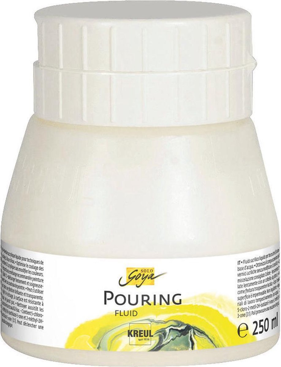 Pouring-Fluid is een transparante vloeistof op waterbasis om te mengen met acryl of hobbyverf om de verf vloeiender te maken en daardoor geschikt voor diverse vormen van pouring-technieken. Kan ook onverdund gebruikt worden als transparante vernis. Droogt glanzend en waterbestendig op en wordt niet geel.