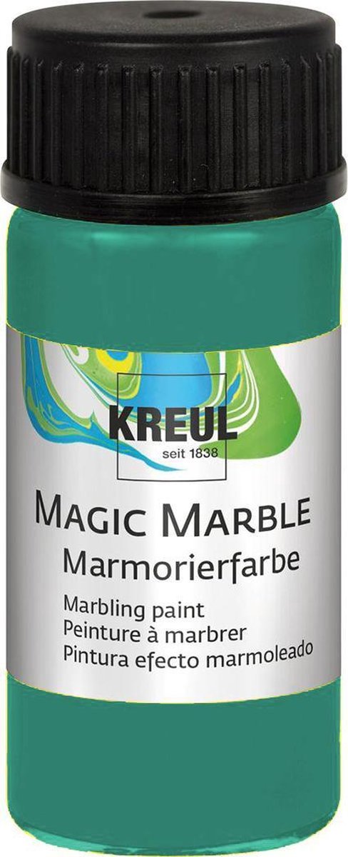 Deze Magic Marble verf van Kreul Hobby Line voorziet elk oppervlak van een uniek marble effect. De toepassingen zijn eindeloos, van gitaren, tot achtergronden van schilderijen. Deze verf is geschikt voor diverse ondergronden zoals hout, karton, metaal, porcelein, kaarsen, etc. Eigenschappen: - droogt snel - matte afwerking - hersluitbaar glazen potje van 20ml - 17 kleurtinten Hoe werkt het? De verf wordt vanuit het potje in een waterbad gedruppeld, eventjes doorroeren, het voorwerp onderdompelen en klaar is kees! Magic Marble is verkrijgbaar in meer dan 30 schitterende kleuren, waaronder ook 2 glittertinten, 4 metallic kleuren, 3 neon kleuren en 4 matte tinten. Verkrijgbaar in glazen potjes van 20 ml met druppelinzet voor eenvoudig en nauwkeurig werken.