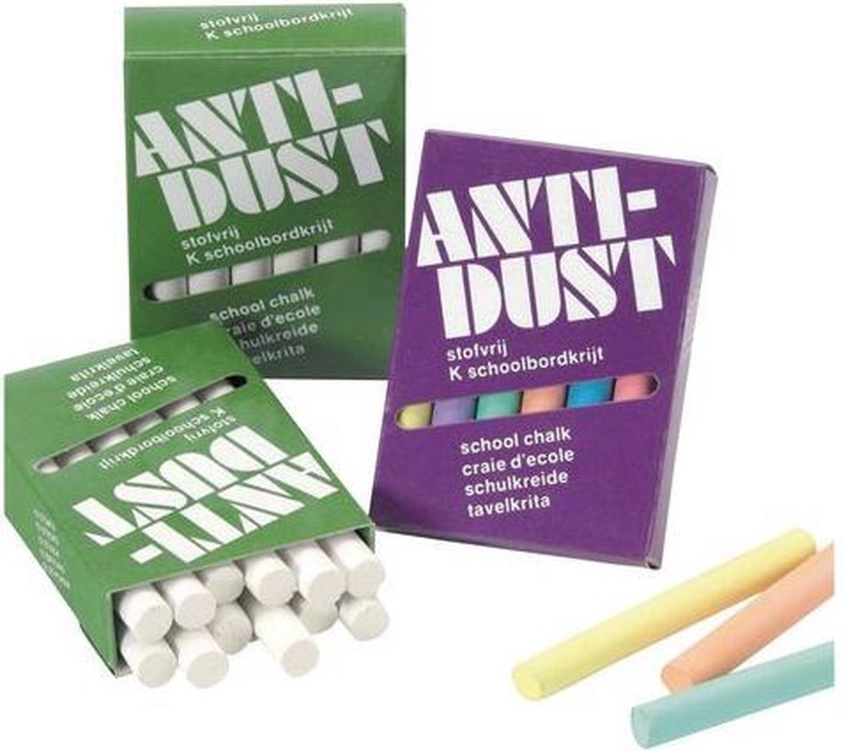 Cylindrisch model Gif en steenvrij Geeft niet af aan de handen Inhoud 4 doosjes van 12 krijtjes (2 x geel. 2 x groen. 2 x bruin. 1 x rood. 1 x oranje. 1 x roze. 1 x violet. 1 x lichtlblauw en 1 x donkerblauw)